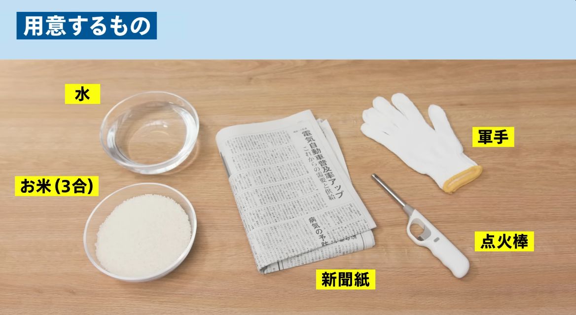 ↓まずは、お米、新聞紙、水、軍手、ライターを用意します。